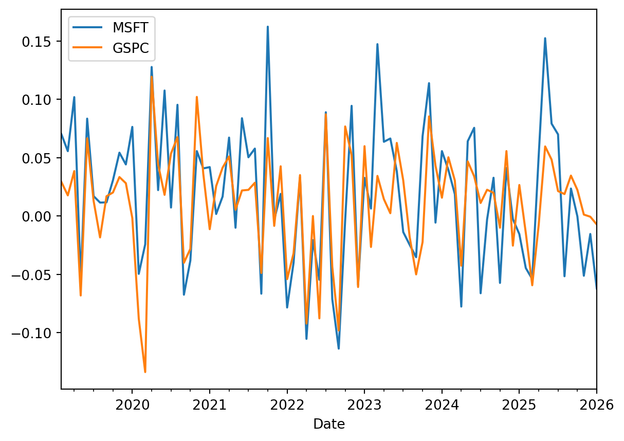import numpy as npimport pandas as pdimport yfinance as yfimport matplotlibimport matplotlib.pyplot as plt# We download price data for Microsoft and the S&P500 index:prices=yf.download(tickers="MSFT ^GSPC", start="2019-01-01",interval="1mo", auto_adjust=True)# We select Adjusted closing prices and drop any row with NA values:adjprices = prices['Close'].dropna()
