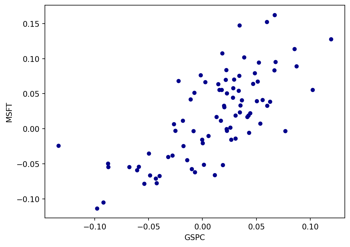 corr2 = cov / (r['MSFT'].std() * r['GSPC'].std())corr2print(f"The correlation between MSFT and GSPC returns is = {corr2}")