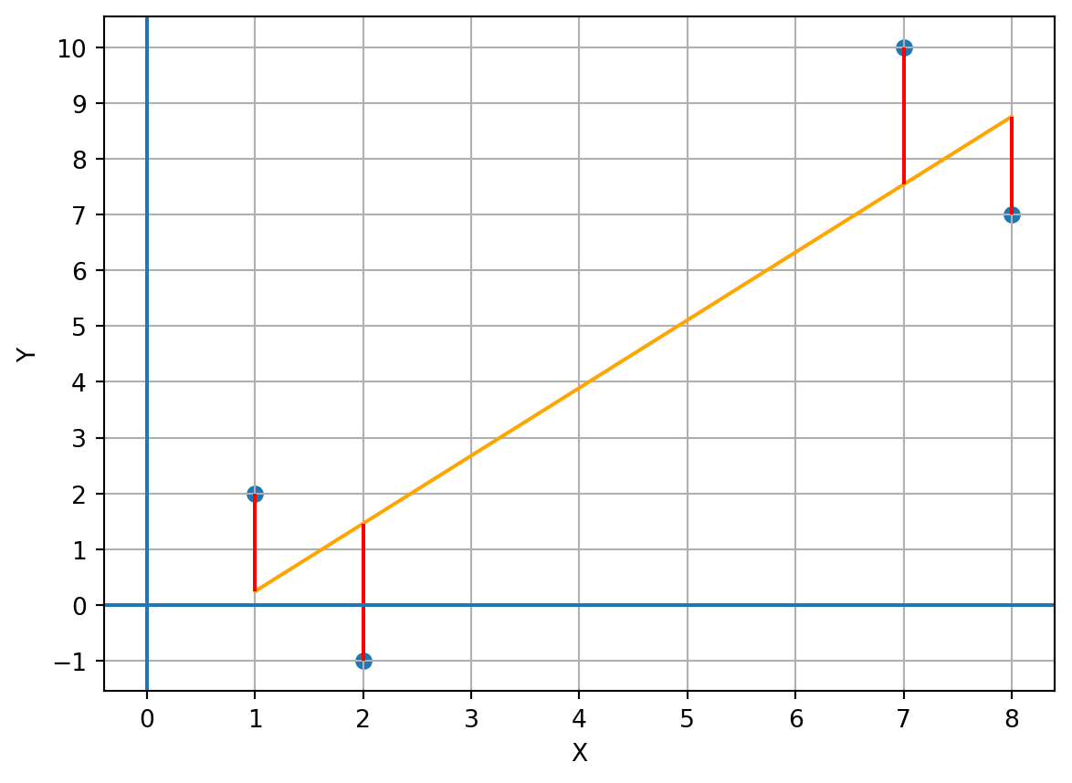 import pandas as pdimport matplotlibimport matplotlib.pyplot as pltimport numpy as np# I create a data frame with the X and Y columns and 4 observations to illustrate linear regression data = {'x': [1,2,7,8],'y': [2,-1,10,7]}df = pd.DataFrame(data)# I calculate the beta coefficients of the line equation that represents the points (the linear regression equation)b1,b0 = np.polyfit(df.x,df.y,1)# I calculate the regression equation with the coefficients:df['yhat'] = b0 + b1*df['x']#plt.clf()plt.scatter(df.x,df.y)plt.plot(df.x, df.yhat,c="orange")plt.xticks(np.arange(-4,14,1))plt.yticks(np.arange(-2,11,1))for i inrange(4): x=df.x.iloc[i] ymin= df.y.iloc[i] ymax=df.yhat.iloc[i]if (ymin>ymax): temp=ymax ymax=ymin ymin=temp plt.vlines(x=x,ymin=ymin,ymax=ymax,color='r')plt.axhline(y=0)plt.axvline(x=0)plt.xlabel("X")plt.ylabel("Y")plt.grid()plt.show()