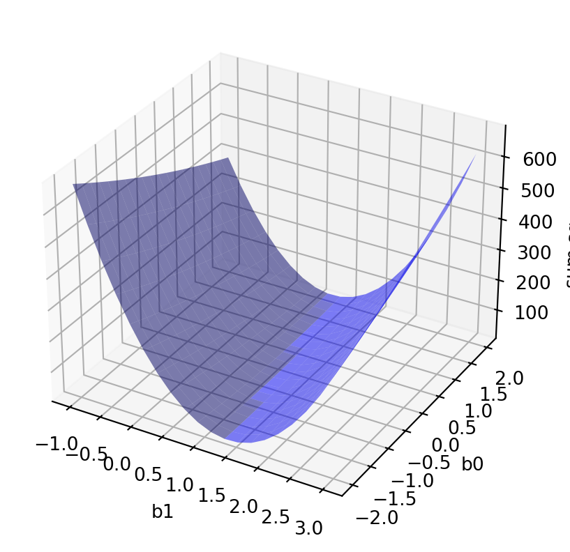 We can do a 3D plot for this function to have a better idea. It is a 3D plot since the function depends on 2 values: b_0 and b_1: