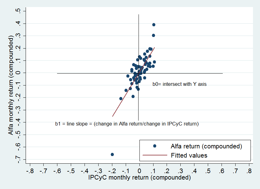 b_{1}=coefficient that represents the slope of the line. This slope represents the average change of the dependent variable (Y) for one unit increase in the independent (X) variable. In this case, b_{1} represents the average change (in percentage points) in the monthly return of Alfa for +1% increase in the IPCyC.