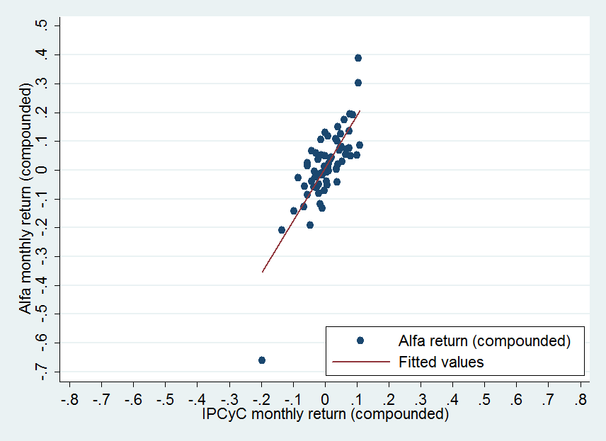We observe that for each increase in 10% of the IPyC return, the increase in the Alfa return is a bit higher than 10%. We can see this in the slope of the fitted line. For example, for 10% increase (0.1) of the IPyC return, the increase in the Alfa return is close to 15% or 17%. The slope of the fitted line represents the sensitivity of Alfa return with respect to changes in the market return. If the fitted line has a slope of 45 degrees, in other words, if it has a slope of 1, then on average for one percent increase in the IPyC, the percentage increase in the Alfa stock return will also be about one percent. If this line has a higher slope (closer to a vertical line), then the sensibility of Alfa with respect to the market will be very high.